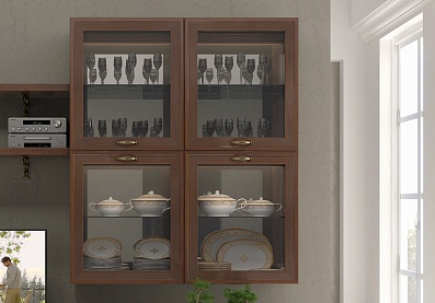 - На задних стенках шкафов со стеклянными вставками есть зеркала. Это помогает зрительно расширить комнату;