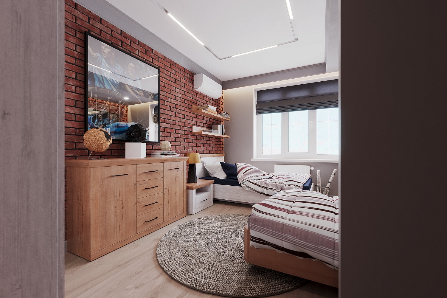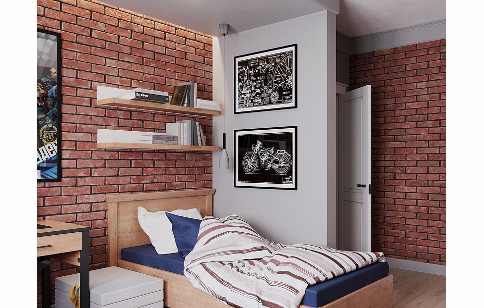 - Молодежная будет гармонировать как с классическими оттенками белого, серого, коричневого, так и с текстурами — деревом, бетоном и кирпичом;